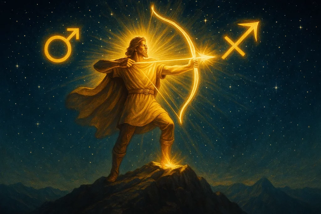 Марс в Стрельце соединяет два сильных начала — огонь действия и огонь веры. Управитель Стрельца — Юпитер, он наделяет марсианскую энергию философской направленностью: теперь важно не просто действовать, а понимать, зачем.